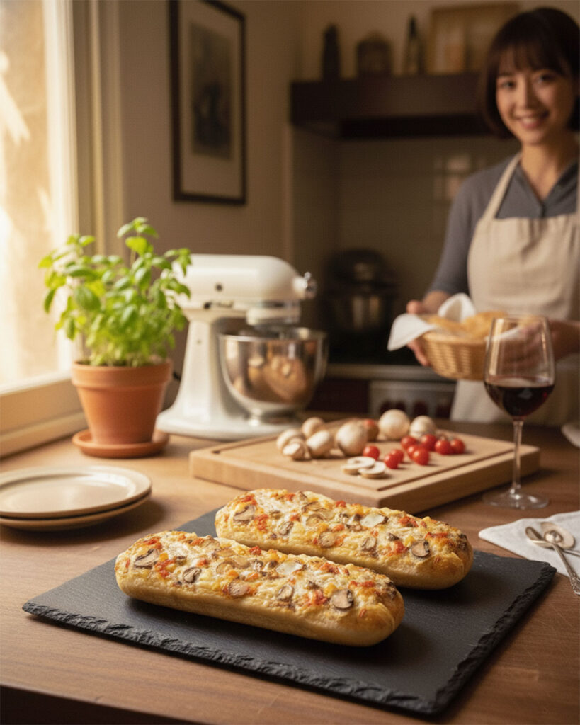 マイルドなサワークリームに、マッシュルーム、トマト、玉ねぎをトッピング。エダムチーズで焼き上げたバゲットです。