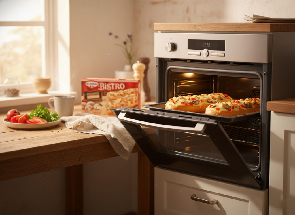 冷凍庫から取り出して、オーブンに入れるだけ。フィルムを外し、予熱したオーブントースターまたはオーブンで10〜12分。あっという間に、香ばしいチーズの香りとともに焼きたての美味しさが広がります。忙しい日でも、ヨーロッパのビストロのようなひとときをお楽しみください。